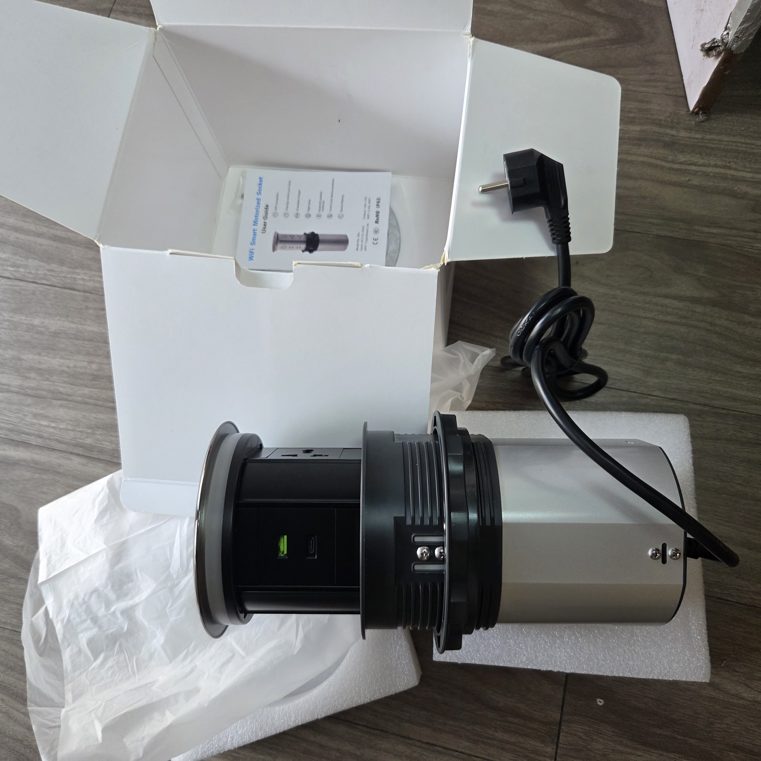 Thiết bị sử dụng mô-tơ điện kết hợp cảm biến chạm (touch sensor). Khi người dùng chạm nhẹ vào nút cảm ứng trên bề mặt, ổ cắm sẽ tự động nâng lên êm ái; khi chạm lại lần nữa, hệ thống sẽ hạ xuống gọn gàng vào bên trong. Toàn bộ quá trình diễn ra mượt mà, hạn chế tiếng ồn và đảm bảo an toàn khi sử dụng.